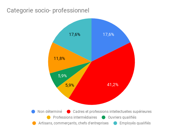 Si l'on regarde le graphique ci-dessus, on peut voir que l'on a 58.8% de personnes qui peuvent être considérées comme CSP+ (Cadres et professions intellectuelles supérieures, Employés qualifiés), ce qui veut donc dire que l'on a 41.2% qui ne le sont pas.